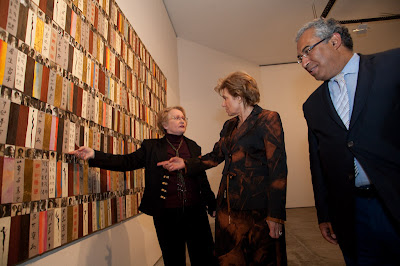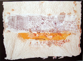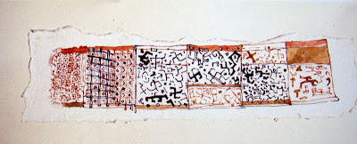 Resta-me acrecentar que, a exposição foi enriquecida com mais trabalhos e todos eles são envolvidos numa Instalação, que tem obras com técnicas mistas, colados em caixas de madeira, panos pintados com os simbolos atràz referenciados e um grande tapete, entre outras peças.