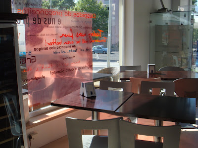 É um "Bistrô", imagine em Lisboa, em que além de comer deliciosamente e ser atendido afectuosamente (coisa rara em Lisboa...) pela Jaquie e o Vasco e pelos empregados Melkianos, ainda pode vêr a minha obra, que são os quadrados que envolvem todas as paredes envidraçadas.